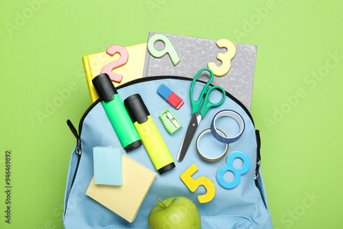 Light blue school backpack with stationery on green background, top view