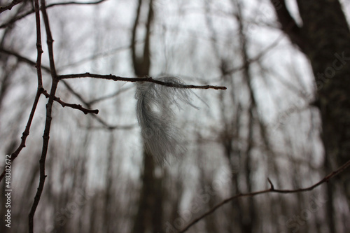 Light gray bird`s feather caught on a branch. Soothing spring landscape. Windy weather. Natural blurred background.