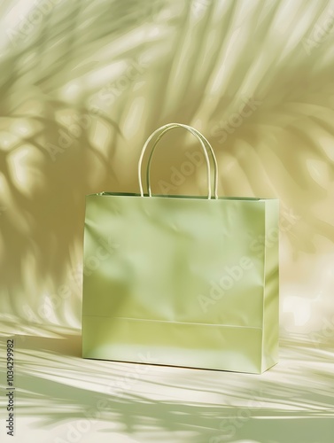 Light Green Shopping Bag on a light Background with Sunlight and Shadows