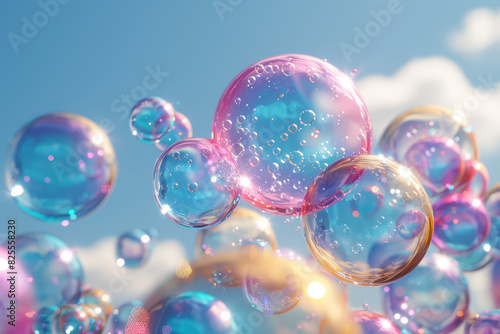 Light pastel bubbles floating in a clear blue sky. Concept of playfulness and whimsy. Generative Ai.