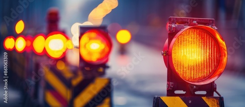 Light signal and barrier systems, barriers for a road construction site, construction site, investment infrastructure and traffic jam. Copy space image. Place for adding text or design