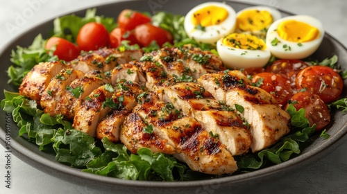 Light veggie salad with greens, eggs, grilled chicken, and dressing on white background.