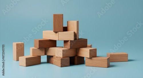 Light wood blocks stack on blue. Soft light reveals wood grain texture. Great for background, poster, branding.