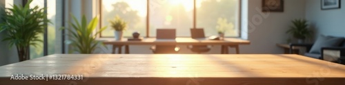 Light wood table, panoramic windows, bright office, corporate, architecture, aesthetic