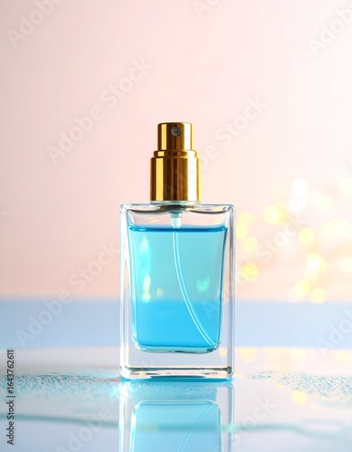 perfume, bottle, glasses, blue, gold, spray, rectangular, liquid, fragrance, cosmetic, beauty, elegant, luxury, stylish, modern, clean, clear, transparent, shiny, light, background, pastel, pink, blurred, bokeh, sparkle, illumination, detail, closeup, product, display, cardboard box, design, empty, scent, sparkling, subtile, fresh, cool, refined, feminine, masculine, unisex