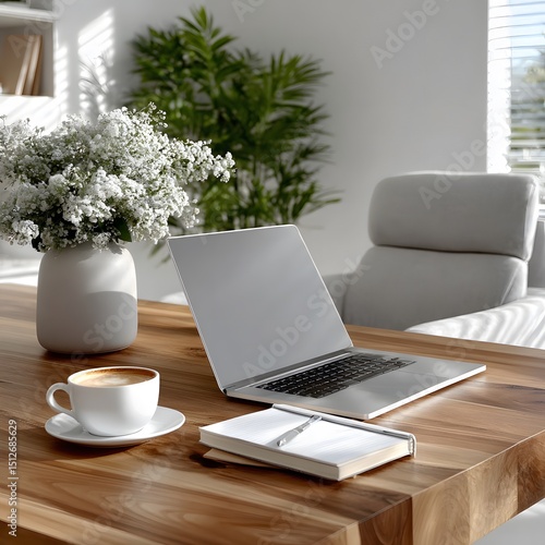 Light-filled, modern workspace with laptop, coffee, and flowers on a wooden table