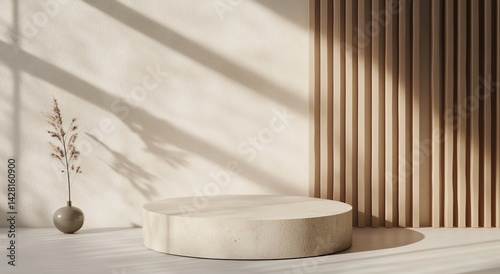 dais, display, racked, product, presentation, empty, wooden, wall, light, shadow, minimalist, beige, neutral, modern, interior, design, home, decor, natural, aesthetic, empty space, mock-up, round, circle, texture, stone, concrete, natural light, sunlight, dried flowers, vase, still life, interior design, photo, rendering, light brown, simple, clean, zen, japanese, scandinavian, calm, peaceful