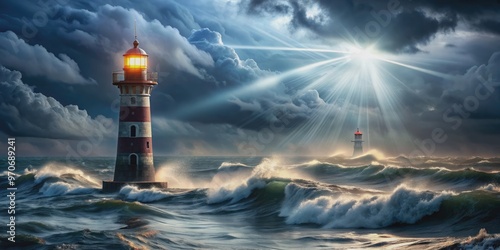 Lighthouse beaming light in stormy waters, Lighthouse, beacon, light, dark, stormy, waves, ocean, safety, navigation