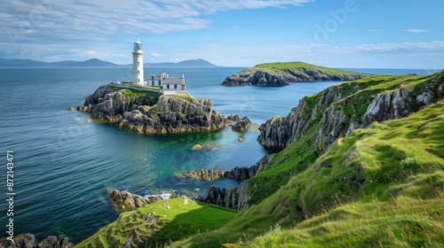 lighthouse, coast, ocean, island, rock, cliff, sea, water, sky, blue, green, nature, landscape, travel, photo, scenery, beautiful, irish, wild, horizon, summer, sun, sunshine, cloud, beach, wave, white, grass, hill, mountain, shore, view, panorama, landmark, historic, tower, light, navigation, bay, gulf