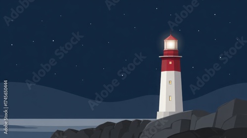 lighthouse shining at night on rocky coast, symbol of guidance and safety, minimalistic
