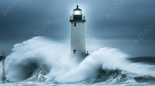 lighthouse stands resilient against powerful ocean waves during storm, showcasing natures raw force and beauty. dramatic scene evokes sense of awe and tranquility amidst chaos