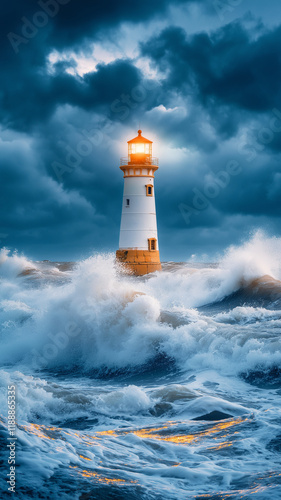 lighthouse stands tall amidst turbulent waves and dark clouds