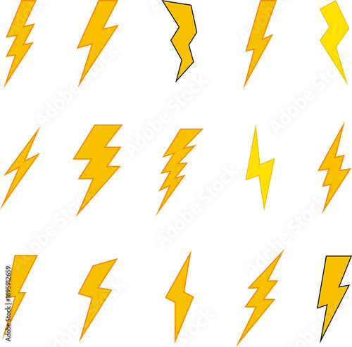 Lightning Yellow Icon Symbol. Thunderbolt shock icon collection. Yellow lightning burst, shouting. Energetic electric flashes for power, speed, danger or action effects. Isolated icons set.