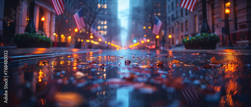 Lights in the city, Street in the city, A Row of American Flags on a City Street. Memorial Day , independence day, usa flag, labor day, illustration