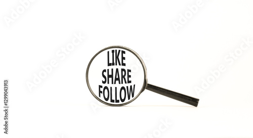 Like share follow symbol. Concept words Like Share Follow on beautiful black magnifying glass. Beautiful white background. Business like share follow concept. Copy space.