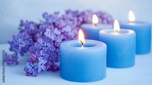 Lilac flower alongside blue candles on a serene white background perfect for relaxation ambiance and floral aesthetics in home decor and wellness settings