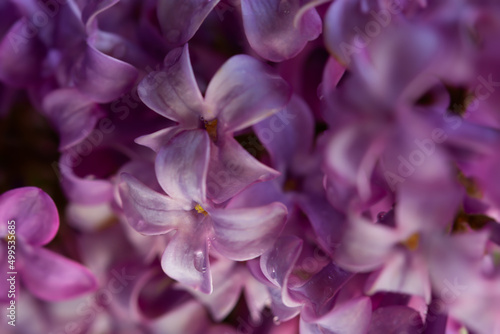 Lilac macro background. Beautiful purple flowers water droplets close-up. Selective focus, blurred foliage background. The concept of freshness, spring flowering, romance. The tenderness of nature.