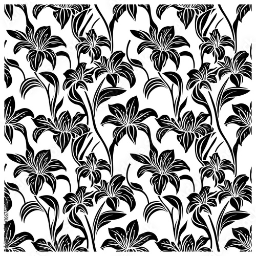 seamless pattern, silhouette, floral pattern, black-and-white, monochrome, textile design, wrapping paper, graphic design, illustration, clip art, white lily