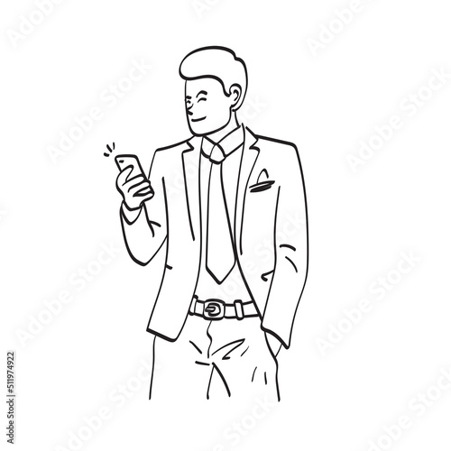 line art businessman using smartphone illustration vector hand drawn isolated on white background