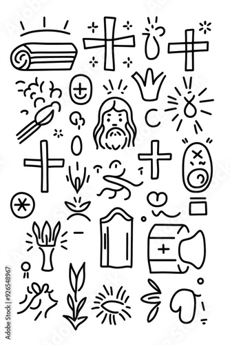 line art drawing of Christian religious icons such as jesus christ, bible and church elements