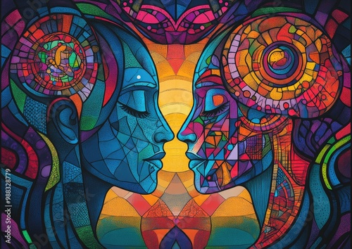 line, art, illustration, stained, glasses, male, female, head, gazing, vibrant, pattern, symbol, essence, science, oneness, forever, series, design, couple, human relationships, creative, colourful, abstract, modern, artistic, decoration, nature, spirituality, harmony, beauty, expression, connection