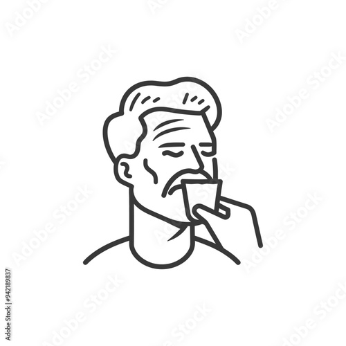 man, person, male, human, drinking, beverage, water, glasses, cup, sip, thirsty, mouth, hand, arm, face, eye, nose, beard, moustache, hair, line, art, illustration, outline, simple
