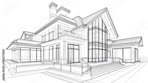 Line art illustration of an architectural drawing of a house building in a three dimensional perspective