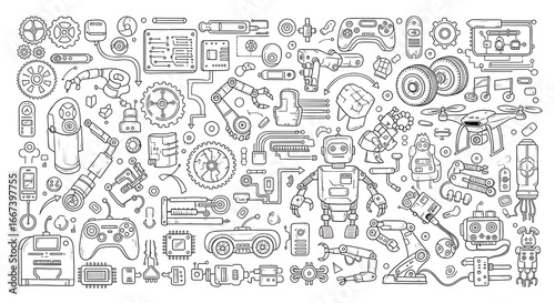 robot, mechanic, technology, engineering, design, automation, robotic, system, device, machine, gear, wheel, circuit, board, microchip, component, part, robotic, arm, control, remote, drone, ai, innovation, industry, future, electronic, equipment, contraption, science, automotive, transportation, connection, interface, communication, tool, object, drawing, outline, vector, illustration, vignetting, concept