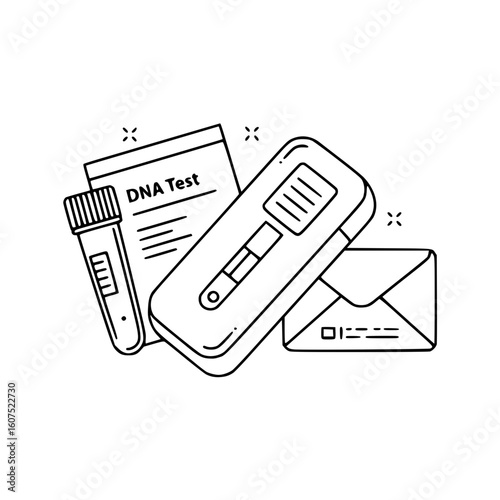deoxyribonucleic acid, test, kit, sample, tube, paperwork, result, envelope, medicals, science, laboratory, analysis, health, exam, genetic, research, isolation, vector, diagnostic, document, health care, investigation, biology, identification, check, assessment, illustration, linear, design, equipment, biomedical, procedure, laboratory, clinical, technology, transparency, drawing, vignetting, simple, plain, minimal, outline, supply, form, test tube, report, letter