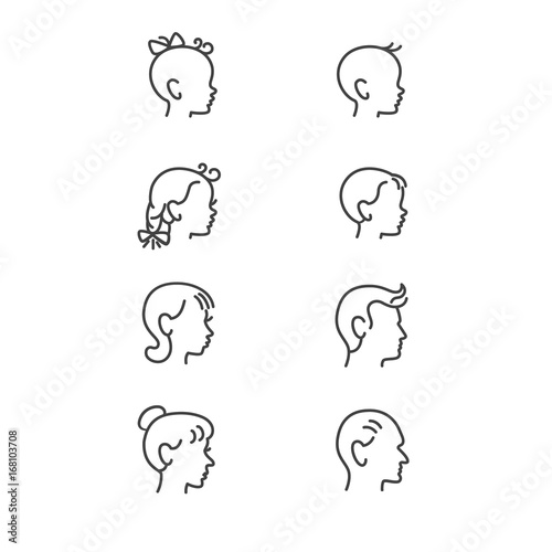 vector, set, line, icon, grey, black, head, man, woman, children, boy, girl, grand, family, hair, beauty, old, age, baby, relative, teenage