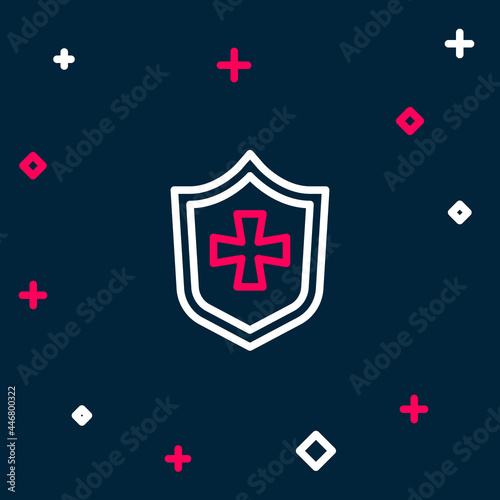 Line Shield icon isolated on blue background. Guard sign. Security, safety, protection, privacy concept. Colorful outline concept. Vector