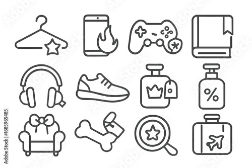 line, style, icon, popular, fashion, hanger, with, star, mobile, phone, flames, gaming, controller, badge, book, icon, tags, earphones, sparkle, sneaker, label, camera, frame, crown, beauty, bottle