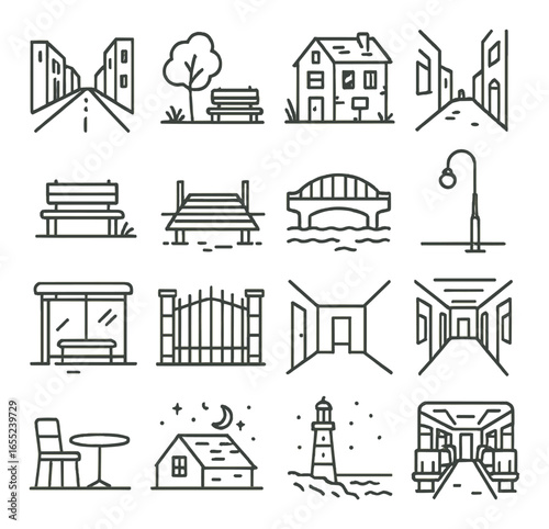 Linear cityscape icon set featuring street, bench, house, alley, bridge, park, gate, and lighthouse symbols
