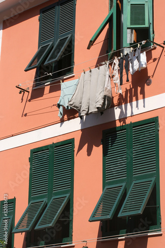 Linge séchant sur un fil aux fenêtres des maisons de Vernazza.