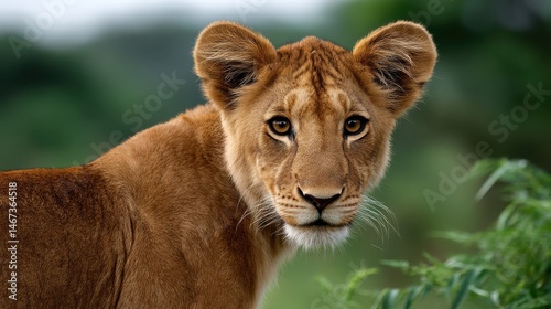 Lion cub looking curiously at the camera, distant capture with vibrant detail and bokeh using 300mm telephoto
