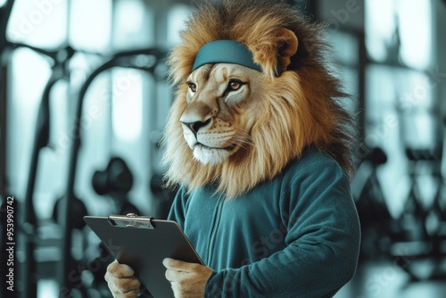 Lion dressed as a gym coach holding a clipboard in a fitness center. Illustrates leadership, fitness, and motivation in a humorous and engaging style.