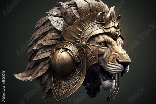 Lion head illustration with spartan helmet, white background. Generative AI