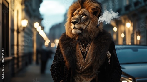 lion, suit, fur, coat, city, street, dusk, pipe, smoking, animal, android, urban, night, street light, gold, brown, black, formal, posh, cool, powerful, majestic, wild, gentleman, luxury, elegant, sophisticated, fashion, style, attitude, pose, portrait, fantasy, photo, art, creative, concept, photo