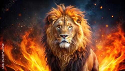 Lion in the night with fiery mane surrounded by flames, lion, night, fire, fantasy, wild, predator, fierce, flames, majestic