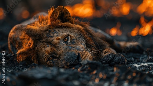 lion, fire, wildfire, ash, resting, mane, powerful, wildlife, nature, savanna, africa, animal, predator, mammal, cat, gold, fur, eye, black, ground, heat, sun, destruction, resilience, survival, burnt, landscape, closeup, portrait, wild, danger, beauty, strength, majestic, fierce