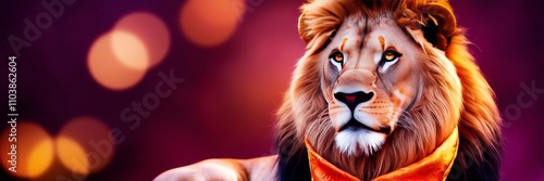 Lion wearing a bright orange scarf against a deep purple bokeh background, Warmth, leadership, and confidence concept. Banner copy space