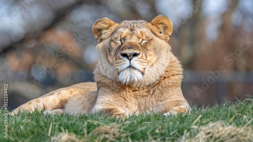 Lioness rests peacefully with closed eyes on grass, bokeh background.