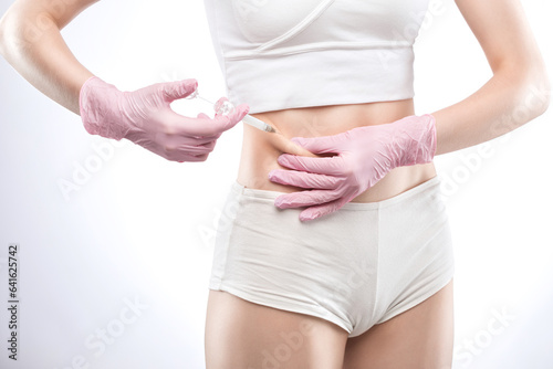 Lipolytic injections for burning fat on the abdomen, legs and thighs of a woman. Women's aesthetic cosmetology in a beauty salon.