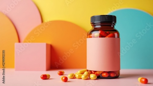 Liquid Vitamins. Amber pill bottle with pink label lying with red and yellow capsules scattered on table, pharmaceutical product promotion, healthcare concept, pastel colorful abstract background, mo