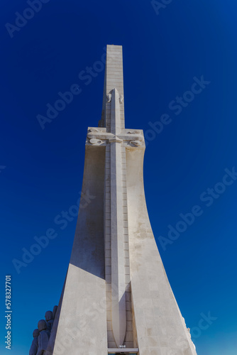 Lisbon, Portugal limestone Monument to the Discoveries. Tagus river Belem waterfront Padrao dos Descobrimentos sword side view.