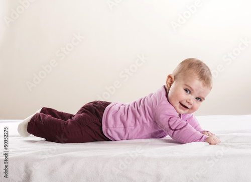 baby, fashion, girl, happy, lying, pink, background, beautiful, bed, cheerful, children, childhood, cute, funny, healthy, infant, isolated, children, laughing, little, looking, 1, small, smiling, soft, studio, sweet, toddler, white, mattress