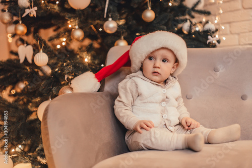 Little baby boy holding gift sitting on sofa in front of Christmas tree .