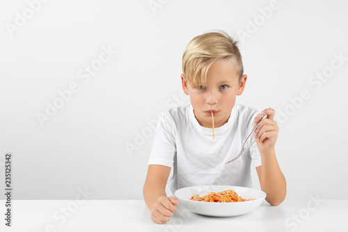 children, spaghetti, ravenous, eating, waist up, meal, food, blonde hair, domestic life, holding, lifestyle, one person, smiling, blue eye, bodycare, boy, casual clothes, childhood, copy space, dining, enjoyment, fork, healthy eating, healthy lifestyle, horizontal, italian food, ketchup, looking, lunch, male, mischief, pasta, penne, plate, ready-to-eat, studio shot, table, white background, white color