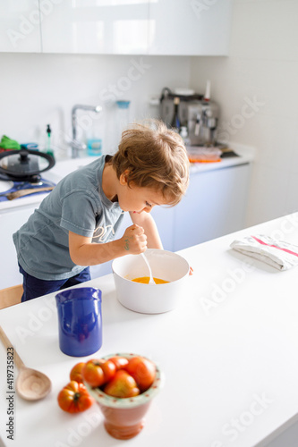 little, boy, cooking, kitchen, home, learning, 1, people, children, day, toddler, leisure, interior, standing, casual attire, cute, innocence, vegetable, food, counter, healthy, nourishment, childhood, spoon, caucasian, lifestyle, bowl, tomatoes, preparation