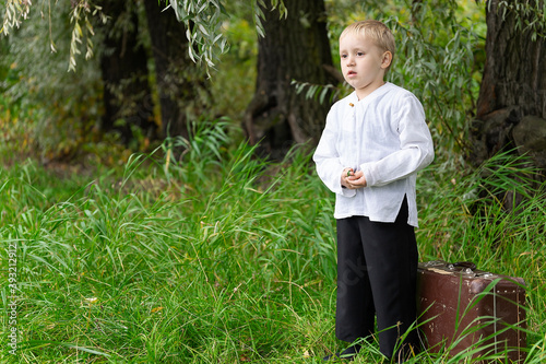Little boy dressed in retro clothes shirt and pants. Stands in the grass and looks sadly into the distance. there is a retro suitcase nearby